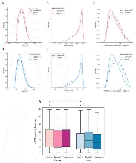 Effects of estradiol or progesterone treatment on structural and functional characteristics of individual mitochondria in RTCs obtained from female and male rats. Distribution of mitochondrial area in RTCs from female (A) and male (D) rats; distribution of eccentricity of mitochondria of RTCs from female (B) and male (E) rats; distribution of TMRE mean fluorescence intensity of mitochondria of RTCs from female (C) and male (F) rats; (G) mPTP opening time. * p < 0.05 (Mann–Whitney test with Bonferroni correction for multiple comparisons).