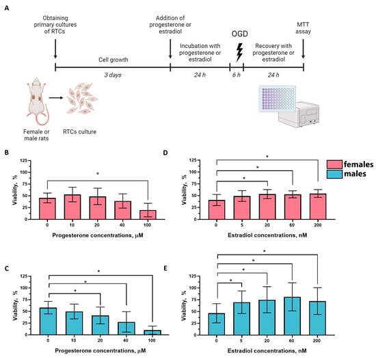 Effects of progesterone and estradiol on the viability of the RTCs, obtained from female (red charts) and male (blue charts) rats, after OGD in vitro. (A) Experimental design; (B) viability of the female RTCs incubated with progesterone and exposed to OGD; (C) viability of the female RTCs incubated with estradiol and exposed to OGD; (D) effects of progesterone on the viability of male RTCs exposed to OGD; (E) effects of estradiol on the viability of male RTCs exposed to OGD. * p < 0.05 (one-way ANOVA with Tukey’s multiple comparison test).