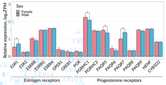 One of the possible explanations for the sex-dependent differences could be the variability in the expression of progesterone and estradiol receptors in female and male kidneys. Indeed, our analysis of the expression of 17 genes of the progesterone and estrogen receptor in available RNA-seq data [] revealed that progesterone receptor membrane component 1 (PGRMC1) and progestin and adipoQ receptor 5 (PAQR5) were significantly upregulated in female compared with male kidneys, whereas ESR1 and progestin and adipoQ receptor 7 (PAQR7) expression was higher in males (Figure 8). Progesterone and estradiol receptors are important for the functioning of renal tissue under both normal and pathological conditions [] and perform their function as transcription factors for numerous genes []. In particular, the knockout of the estradiol receptor ESR1 in epithelial cells led to the dysregulation of TGF-β expression and the activation of the inflammatory response, while the overexpression of ESR1 reduced the level of ischemic damage through the inhibition of the TGF-βRI-SMAD cascade []. Earlier, we proposed that the lack of progesterone effects in unilateral ureteral obstruction may be due to the decreased expression of PAQR5 in the kidney [].