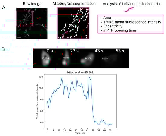 The scheme of analysis of the morphological and functional characteristics of individual mitochondria in RTCs isolated from the kidneys of female and male rats. (A) Confocal microscope’s video processing pipeline including mitochondrial segmentation with MitoSegNet, tracking with STracking, and the analysis of characteristics such as area, TMRE mean fluorescence intensity, eccentricity, and the mPTP opening time. Scale bar: 10 μm; (B) An example of the mPTP opening. A sharp drop in the TMRE mean fluorescence intensity in the mitochondria between 40 and 48 s in this example was detected as the mPTP opening, which was also visually noticeable in the video of these mitochondria.