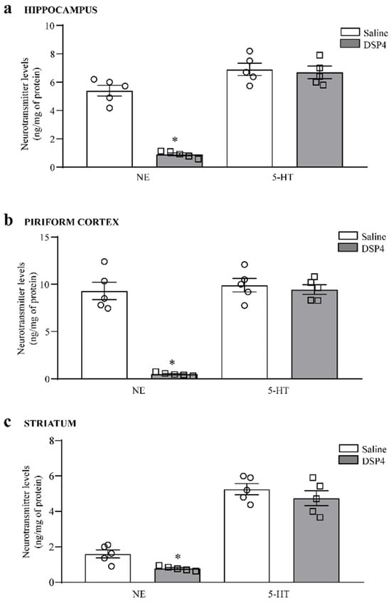 2.1. DSP4 Induces Specific and Severe Loss of NE Terminals within Limbic Regions, Leaving Unmodified 5-HT Levels