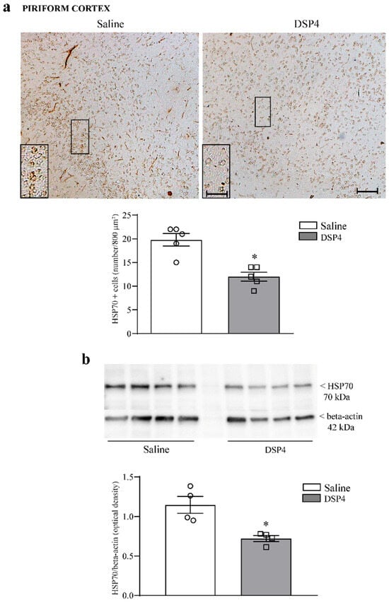 DSP4 decreases the number of HSP70i-immunopositive neurons and the expression of HSP70i protein within the piriform cortex. In slices from the anterior piriform cortex stained for HSP70i, the density of HSP70i-positive cells was expressed as the number of cells per 800 μm2. These cells are evident in the upper part in Figure 4a showing representative pictures, where a loss of HSP70i-positive neurons appears to occur mostly in the deep layer of the piriform cortex. This is emphasized in the insert, reporting an area at higher magnification. The number of HSP70-stained cells is reported in the graph (a), where counts of saline-injected mice are compared with DSP4-treated mice. Data are expressed as the mean ± S.E.M. In (b), immunoblotting for HSP70i protein is reported from the whole piriform cortex. In this case, the loss of HSP70i protein is slighter compared with the loss of HSP70i-expressing cells, which was previously reported within the hippocampus (Figure 3). In (a,b), the effects obtained in the groups administered either saline (N = 4) or DSP4 (N = 4) were compared using one-way ANOVA with Sheffè’s posthoc test. The null hypothesis was rejected for p ≤ 0.05. * p ≤ 0.05 compared with saline. Scale bar = 100 μm; 20 μm (insert). Circles and squares represent values referred to each single saline- or DSP4—injected mouse, respectively.