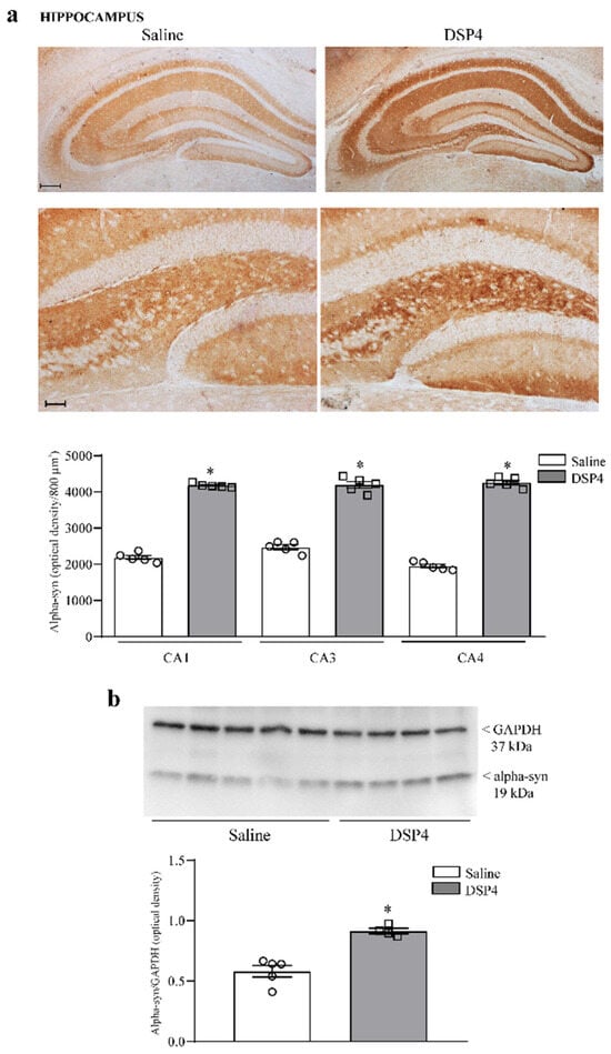 DSP4 increases the amount of alpha-syn within the hippocampus. In hippocampal slices stained for alpha-syn, the density of alpha-syn was expressed as optical tissue density since single cells were not detectable. Representative pictures are evident in the upper part in Figure 6a, showing an increase in alpha-syn in all (CA1, CA3, CA4) sub-fields of cornu ammonis, which extends to a lesser extent to dentate gyrus (see also Supplementary Figure S1). The amount of optical density is reported in the graph, where counts of saline-injected mice are compared with DSP4-treated mice, and all measurements were carried out considering the corpus callosum as a reference (refer to Supplementary Figure S2 for representative similar negligible staining for alpha-syn from saline-injected and DSP4-injected mice, where densitometry does not significantly differ). Data are expressed as the mean ± S.E.M. In (b), immunoblotting for alpha-syn protein is reported from the whole hippocampus. The increase in alpha-syn protein is comparable with the increase in alpha-syn density from hippocampal slices reported in (a). In (a,b), the effects obtained in the group administered saline (N = 5) and DSP4 (N = 4) were compared using one-way ANOVA with Sheffè’s posthoc test. The null hypothesis was rejected for p ≤ 0.05. * p ≤ 0.05 compared with saline. Scale bar = 100 μm; 50 μm (low and high magnification, respectively). Circles and squares represent values referred to each single saline- or DSP4—injected mouse, respectively.