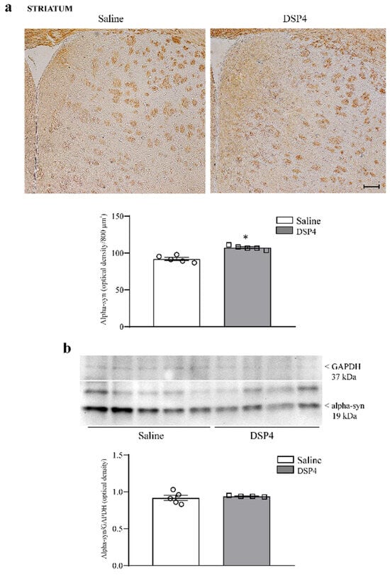 DSP4 slightly affects the amount of alpha-syn within the dorsal striatum. As reported in representative pictures placed in the upper part in Figure 8a, in slices from the dorsal striatum stained for alpha-syn, tissue staining density does not allow us to distinguish single cells. Therefore, it shows the amount of alpha-syn-stained tissue within specific spots from saline-injected mice and DSP-4-injected mice. Relative densitometry is expressed by optical tissue density compared with corpus callosum (as shown in Supplementary Figure S2). Even in this case, stained areas where optical density was calculated correspond to rectangles of 800 μm2, and they were chosen randomly within striatal tissue. Random sampling was needed since the staining was patchy, providing alternate pale and dark areas. The amount of alpha-syn staining slightly increases in mice administered DSP4, as reported in the graph, where counts in saline-injected mice are compared with DSP4-treated mice. Data are expressed as the mean ± S.E.M. In (b), immunoblotting for alpha-syn protein within the dorsal striatum is reported, with no significant effects induced by DSP4. In (a,b), the effects obtained in the group administered saline (N = 5) and DSP4 (N = 4) were compared using one-way ANOVA with Sheffè’s posthoc test. The null hypothesis was rejected for p ≤ 0.05. * p ≤ 0.05 compared with saline. Scale bar = 100 μm. Circles and squares represent values referred to each single saline- or DSP4—injected mouse, respectively.