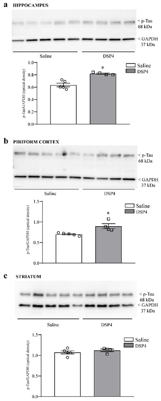 Similarly to alpha-syn, p-Tau protein was increased in the immunoblotting from the hippocampus (Figure 9a) and piriform cortex (Figure 9b) from DSP4-treated mice, while no significant effect was detected when immunoblotting the striatum from mice administered DSP4 compared with the controls (Figure 9c).