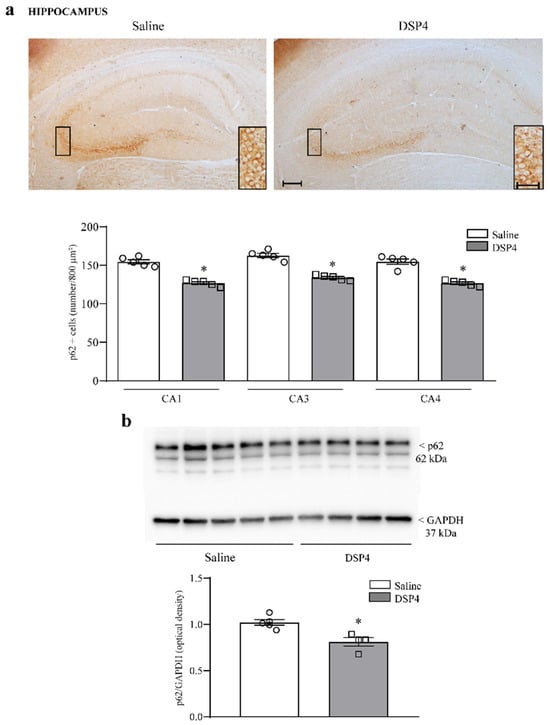 DSP4 decreases the number of p62-positive neurons and the expression of p62 protein within the hippocampus. In hippocampal slices stained for p62, the density of p62-positive cells was expressed as the number of cells per 800 μm2. These cells are evident in the upper part in Figure 10a, showing representative pictures, where the loss of p62-positive cells occurs in all sub-fields of cornu ammonis of the hippocampus, although the levels of p62 were more abundant within CA3 compared with other sub-fields. It is remarkable that no staining for p62 was detected within the dentate gyrus in the controls or in LC-NE-lesioned mice. The number of p62-stained cells is reported in the graph, where counts of saline-injected mice are compared with DSP4-treated mice. Data are expressed as the mean ± S.E.M. In (b), immunoblotting for p62 protein is reported from the whole hippocampus. In (a,b), the effects obtained in the group administered saline (N = 5) and DSP4 (N = 4) were compared using one-way ANOVA with Sheffè’s posthoc test. The null hypothesis was rejected for p ≤ 0.05. * p ≤ 0.05 compared with saline. Scale bar = 100 μm; 20 μm (insert). Circles and squares represent values referred to each single saline- or DSP4—injected mouse, respectively.