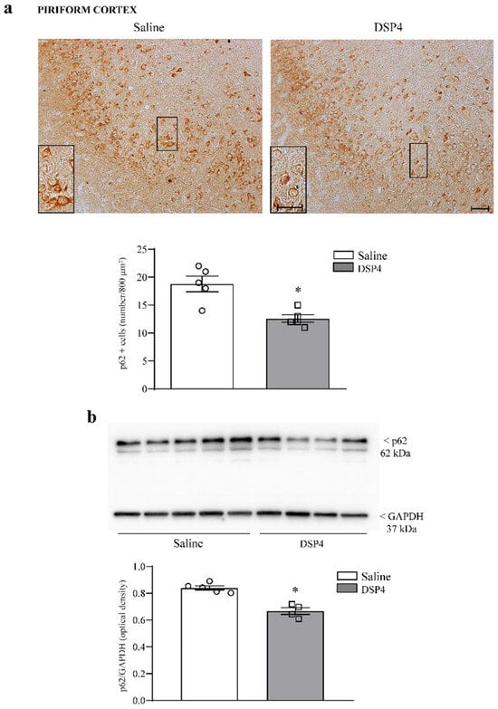 DSP4 decreases the number of p62-positive neurons and the the expression of p62 within the piriform cortex. In slices from the anterior piriform cortex stained for p62, the density of p62-positive cells is expressed by the number of stained cells per 800 μm2. These cells are evident in the upper part in Figure 11a, showing representative pictures, where the loss of p62-positive neurons in DSP4-treated mice occurs mostly in the deep layer of the piriform cortex, which is indicated in the insert at higher magnification. The number of p62-stained cells are reported in the graph, where counts of saline-injected mice are compared with DSP4-treated mice. Data are expressed as the mean ± S.E.M. In (b), immunoblotting for p62 protein is reported from the whole piriform cortex. In (a,b), the effects obtained in the group administered saline (N = 5) and DSP4 (N = 4) were compared using one-way ANOVA with Sheffè’s posthoc test. The null hypothesis was rejected for p ≤ 0.05. * p ≤ 0.05 compared with saline. Scale bar = 100 μm; 20 μm (insert). Circles and squares represent values referred to each single saline- or DSP4—injected mouse, respectively.