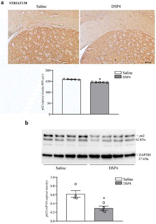 DSP4 does not modify the tissue density of p62 and the expression of p62 within the dorsal striatum. In (a), p62-stained slices from the dorsal striatum in the saline-injected controls or DSP4-injected mice did not allow us to detect any cell shape, as evidenced in representative pictures reported in the upper part in Figure 12a. Therefore, p62 immunostaining was reported as tissue density. In DSP4-treated mice, a slight decrease in optical density was observed compared with the controls, and it is reported in reference to corpus callosum, as shown in Supplementary Figure S2. These values are reported in the graph, where counts of saline-injected mice are compared with DSP4-treated mice. Data are expressed as the mean ± S.E.M. In (b), immunoblotting for p62 protein within the dorsal striatum is reported, which decreased in DSP4-treated mice compared with the saline-treated controls. In (a,b), effects obtained in the groups administered saline (N = 4) and DSP4 (N = 4) were compared using one-way ANOVA with Sheffè’s posthoc test. The null hypothesis was rejected for p ≤ 0.05. * p ≤ 0.05 compared with saline. Scale bar = 100 μm. Circles and squares represent values referred to each single saline- or DSP4—injected mouse, respectively.