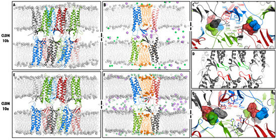 Strikingly, the ion conduction pathway differed strongly between CLDN10a and -10b in the inner half of the pore (Figure 1 and Figure 6). While the pore center in CLDN10a models is formed by N54 and H60 residues, it is formed by D56 and N62 residues at the corresponding positions in CLDN10b models. Close to the center, both claudins contain a different positively charged residue (R62/K64). Next to this position, CLDN10a contains another positively charged R33, whereas in CLDN10b, the negatively charged D36 is located. Importantly, these residues are contributed by the interlocked β1β2 loop of adjacent subunits that are not part of the tetrameric core barrel. Further to the pore periphery, the charged K69 is present in CLDN10a instead of the non-polar A71 in CLDN10b. CLDN10a also contains more additional polar pore-lining residues than CLDN10b. In sum, this leads to an opposite electrostatic potential on the pore-lining surface for the two different claudin channels (Figure 7A–D). Consequently, the pore-lining residues of CLDN10a attracted and interacted strongly with Cl− ions, whereas that of CLDN10b did so with Na+ ions (Figure 7E and Figure 8C,D). This resulted in anion transport through CLDN10a channels in contrast to cation transport through CLDN10b channels (Figure 8). Thus, in total, the simulations fit very well to the charge-selectivity of the two claudin channels and contributions of ECS1 residues, in particular of R33 and R62 in CLDN10a, that were demonstrated by electrophysiological measurements [35,36,38,39].