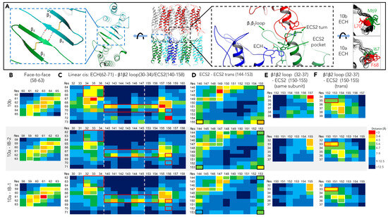 Inter-subunit residue contact maps for CLDN10b and CLDN10a models. (A) Overview of different inter-subunit interfaces. Middle: Front view on CLDN10a dodecamer with subunits as colored cartoons. Left: Turned view on ECS1+2 of two bottom subunits (dashed blue box in the middle) highlighting face-to-face cis interface with H-bonds between β4 strands. Right: Close-up of the dashed black box in the middle highlighting the linear-cis interface between the ECH region (blue) and ECS2 pocket (green) and trans-interface between two ECS2 turn regions (green, red). Relevant residues are shown as sticks. Far right: Comparison of CLDN10a and CLDN10b ECH regions. Overlay of several subunits showing different orientations of F68/I67 in CLDN10a and of corresponding L70/M69 in CLDN10b model. (B–F) Mean distances (closest atoms) between the numbered residues of protein region pairs reflecting the different interface types. For each interface type, the multiple individual interfaces in the dodecamer were averaged. Shown are interaction-relevant parts of contact maps categorized according to interface types: (B) face-to-face-cis, (C) linear-cis, (D) ECS2-ECS2-trans, and (E,F) β1β2 loop-ECS2. In headlines, corresponding residue numbers of CLDN10a are given in brackets. Residue contact pairs are boxed in white if similar, in red if shifted, and in black when different between CLDN10a and -10b. The contact maps provide interface fingerprints for comparison of the different claudin models. CLDN10b data taken from previous simulations [15].