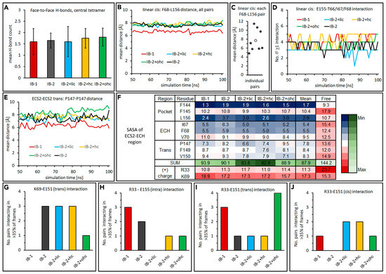 (ii) For the linear-cis interface, the distance between F68 (Cγ, ECH region) and L156 (Cγ, ECS2 pocket) was measured over time. For all CLDN10a models, the distance was constant over time, and for IB-2, IB-2+lic, IB-2+hc, IB-2+ohc~7.7 Å, and IB-1~6.6 Å (mean of all interfaces in dodecamer, Figure 3B). However, the mean distance differed between individual linear-cis interfaces within a dodecamer, as shown for IB-2 as an example (Figure 3C). In addition, individual interfaces with at least one electrostatic interaction between the ECS2 pocket (E155) and ECH region (T66, I67, F68) were counted over time. For the different models, 4 ±1 out of 8 possible counts were obtained mostly and relatively constant over time (Figure 3D). Together, the measurements indicated that the linear-cis interface was largely maintained during the simulations for all CLDN10a model variants, similar to those shown for the corresponding CLDN10b model previously [15].