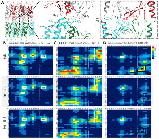 The pore is in the central half on each side, bounded by cis- and trans-associations of β1β2– and β3β4 loops of four subunits (Figure 1G and Figure 4A, [15]). Here, three different pairwise subunit combinations (i–iii) come into contact (Figure 4A,B–D headlines). For each combination, respective residue contact maps were generated for the CLDN10a IB-1 and IB-2 simulations and compared with those of previous CLDN10b simulations [15]: