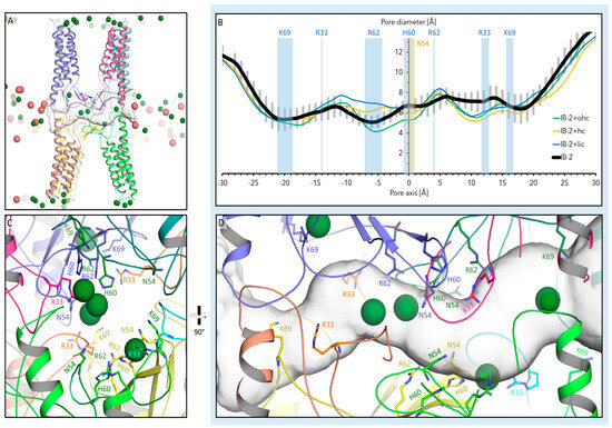The ion permeation path in the CLDN10a dodecamer models (IB-2, IB-2+lic, IB-2+hc, and IB-2+ohc) was inspected by analyzing the diameter along the axis of the middle pore in the last 50 ns of the simulation (using HOLE). The pore profiles of the models differed up to 2.5 Å with respect to the mean diameter at particular positions along the pore axis (Figure 6B). The mean diameter differed also on both sides of the pore center that was surrounded by four N54 and four H60 residues (Figure 6B–D). For the reference model IB-2, the center showed a mean diameter of 6.7 Å. For IB-2 and IB-2+hc, on one side, the R62 region formed the narrowest site (5.1 Å for IB-2), whereas on the other side, the R62 region was wider (7.4 Å for IB-2) than around H60. Nevertheless, for all models, the mean pore diameter in the inner pore region (spanning R33-R62-H60-R62-R33) was smaller than in the pore periphery beyond K69 residues. To what extent do the mentioned variations reflect the limited precision of the simulations in these details or the inherent flexibility of the CLDN10a channels? This will be a topic for further refinement studies. Nevertheless, the simulations indicate that the constriction site of the CLDN10a channels is formed in the central H60/R62 region. In sum, similar to CLDN10b channel simulations, those for CLDN10a showed constriction in the pore center with a similar minimal diameter of 5.1 Å (5.2 Å for CLDN10b 8IBno [15]). This pore diameter is in agreement with experimental measurements [35,40]. While the pore center of CLDN10a and-10b channels were formed by the corresponding residues (N54/H60 in CLDN10a and D56/N62 in -10b), the constriction site for CLDN10a was not observed in the very center of the pore but next to it (R62).