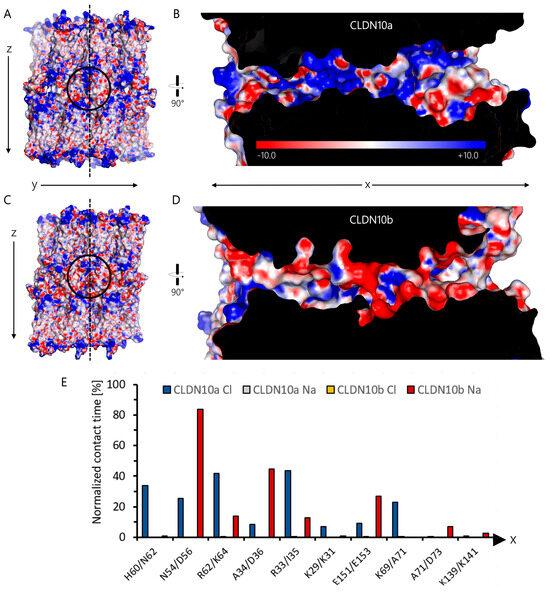 Electrostatic surface potential (ESP) map of CLDN10a (A,B) and CLDN10b (C,D) channel models. (A,C) Electrostatic potential mapped on dodecamer protein surface of 100 ns snapshots of CLDN10a IB-2 and CLDN10b [15] simulations. Front view along y and z axes. (B,D) Clipped cross-section along x and z axes at the middle position of dodecamers (dashed line in (A,C)). The internal protein region is shown in black. Electrostatic surface potential calculated with Poisson–Boltzmann equation Solver (PBEQ-Solver) is shown color-coded (−10 to +10 kCal/mol.e). ESP of the pore-lining surface differs strongly between CLDN10a and -10b. (E) Contact time of relevant pore-lining residues with Cl−) and Na+ ions. The contact profile differs strongly between the two channels. The residues (CLDN10a/-10b) are ordered according to their position along the x-axis from the pore center towards the two-pore entrances. For the calculation of normalized contact time, the percentage of time frames in which the respective residue was closer than 4 Å to at least one ion was calculated for each subunit lining the central pore and averaged.
