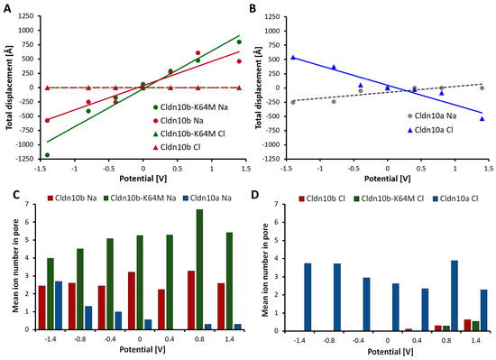 Finally, we investigated the charge selectivity of CLDN10 channels by applying an external voltage gradient (Figure 8). The low-resistance pathway on both sides of the dodecamer hindered measurement of the ionic current and calculation of the conductance as determined experimentally [35,39]. However, as a quantitative estimate of the ion movement through the channel and as an approximation of the charge selectivity of the pore, total ion displacement between the two ends of the channel over the simulation time was calculated. For CLDN10b, the total displacement of the Na+ ions depended linearly on the voltage and was between 578 Å in one direction for −1.4 V and 457 Å in the opposite direction for 1.4 V. In contrast, the total displacement of Cl− ions was 0 Å for all voltages, clearly showing the cation selectivity of the channel (Figure 8A). We also analyzed the CLDN10b mutant K64M that was suggested to enhance Na+ ion interaction [15]. For CLDN10b-K64M, the slope of the linear fit of the relationship between the total ion displacement and voltage was slightly higher than for CLDN10b-wt, suggesting a slightly higher Na+ conductance for the mutant, as expected. For CLDN10a, the total ion displacement of Cl− ions was 544 Å for −1.4 V and 536 Å for 1.4 V in opposite directions. The total ion displacement of Na+ ions was −255 Å for −1.4 V and 0 Å for 1.4 V. The absolute value of the slope of the linear fit for the Cl− total displacement was higher than that for the Na+ total displacement, indicating the anion preference of the CLDN10a channel (Figure 8B).