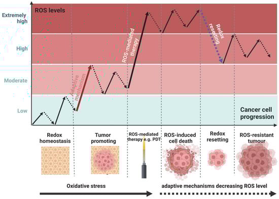 Relationship between reactive oxygen species (ROS) level and cancer cell progression. Modified from Liu et al., Gorrini et al., and Nakamura et al. [,,]. Created with Biorender.com.
