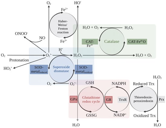 Antioxidant system: Superoxide Dismutase (SOD), Catalase (CAT), and Glutathione/Thioredoxin redox cycle enzymes. Abbreviations: CAT-Fe3+, ferricatalase; CAT-Fe4+O, compound I; GPx, glutathione peroxidase; GR, glutathione reductase; GSH, glutathione; GSSG, glutathione disulfide; H2O2, hydrogen peroxide; HO•, hydroxyl radical; HO2•, hydroperoxyl radical; NADPH, nicotinamide adenine dinucleotide phosphate; NO, nitric oxide; O2•–, superoxide anion; ONOO−, peroxynitrite; Prx, peroxiredoxins; ROS, reactive oxygen species; Trx, thioredoxin; TrxR, thioredoxin reductase [].