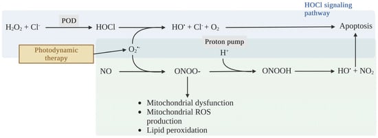 Another trail of apoptosis-mediated PDT is the NO/peroxynitrite signaling pathway (Figure 3). NO plays a vital role in both metabolic and cardiovascular balance, boasting properties that promote vasodilation, combat inflammation, and prevent thrombosis, as well as acting as an antioxidant []. Yet, when NO swiftly interacts with superoxide anions, it results in the formation of a potent oxidant known as peroxynitrite. This formidable oxidant has the capacity to modify a range of molecules. Among its targets are the heme of soluble guanylate cyclase, various lipids, and the endothelial NOS cofactor BH4. Such interactions can result in mitochondrial dysfunction, escalated ROS production, and lipid peroxidation []. Furthermore, peroxynitrite can be protonated to peroxynitrous acid (ONOOH) before decomposing to nitrogen dioxide (NO2) and the apoptosis-inducing hydroxyl radical. This protonation can specifically occur in the membrane of tumor cells, due to the acidic conditions in the presence of the proton pump of tumor cells. The in-depth mechanisms of HOCl and NO/peroxynitrite signaling have been thoroughly explained by Bauer and co-workers [,].