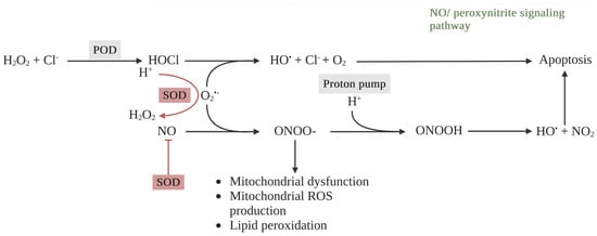 In unhealthy cells, SODs impair the apoptosis induction of tumor cells by interrupting the hypochlorous acid (HOCl) and NO/peroxynitrite signaling pathways. Tumor cells require a high production rate of extracellular superoxide anions and H2O2 to maintain their development and progression [,,]. On the other hand, H2O2 is a primary substrate for HOCl generation in the pathway of apoptosis-mediated PDT, namely HOCl signaling (Figure 3). HOCl is a potent oxidizing agent and, under physiological conditions, is mainly generated by the interaction between H2O2 and the chloride anion (Cl−), catalyzed by peroxidases (PODs), such as myeloperoxidase (MPO) or the peroxidase domain of dual oxidase (DUOX) [,]. After interaction with extracellular superoxide anions in tumor cells, HOCl yields an apoptosis-induced hydroxyl radical, which results in selective anti-tumor activity. Hence, the anti-tumor activity of HOCl signaling correlates with the hydroxyl radical level, which depends on the superoxide anion and HOCl levels in tumor cells. Hydroxyl radicals can reach the cell membrane and trigger lipid peroxidation, specifically in the membrane of tumor cells. Then, apoptosis is activated in the mitochondrial pathway relating to caspase-9 and -3 activity [,,,,]. Furthermore, HOCl modulates immune response through an accumulation of neutrophils and the induction of tumor necrotic factor α (TNFα) production in peripheral blood mononuclear cells, contributing to inflammatory responses [,].
