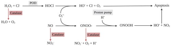 Apoptosis-inducing signaling through the hypochlorous acid (HOCl) and nitric oxide (NO)/peroxynitrite pathways [,].