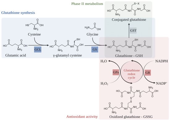 Not only is catalase responsible for removing H2O2, but is also responsible for the removal of nicotinamide adenine dinucleotide phosphate (NADPH)-dependent antioxidants; glutathione (GSH; L-γ-glutamyl-L-cysteinyl-glycine) and thioredoxin-peroxiredoxin redox systems facilitate elimination of H2O2 (Figure 2) [,]. GSH is an intracellular antioxidant molecule that plays a crucial role in maintaining redox status, xenobiotic metabolism, and regulation of gene expression and programmed cell death (Table 1). Two ATP-dependent enzymes regulate the synthesis of GSH, as follows: (1) glutamate–cysteine ligase (GCL) or γ-glutamylcysteine synthetase (GCS) that facilitates the formation of γ-glutamyl cysteine using glutamic acid and cysteine, and (2) GSH synthase (GS) that catalyzes the addition of glycine to the dipeptide (Figure 6). The γ-glutamyl bond makes glutathione more resistant to degradation by cellular proteases, which typically cleave α-peptide bonds. Additionally, the presence of the γ-glutamyl bond has implications for transporting glutathione and its precursor amino acids across cell membranes. Specific transporters in cell membranes recognize the γ-glutamyl moiety and facilitate the uptake of glutathione []. Under oxidizing conditions, GSH shows antioxidant activity via acting as a reducing agent or electron donor to reduce H2O2, lipid hydroperoxides (LOOHs), and peroxynitrite, before being converted to oxidized glutathione or glutathione disulfide (GSSG) by glutathione peroxidase (GPx), resulting in a decrease in the GSH/GSSG ratio. GSSG can be converted back to GSH using NADPH, catalyzed by glutathione reductase (GR) [,,].