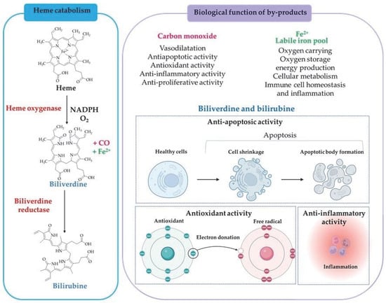 The degradation products of heme are essential biologically active compounds (Figure 7). Carbon monoxide (CO) is a toxic gas that can be deadly in high concentrations []. However, some studies have shown that low levels of CO generate cell-protective effects. Moreover, CO has anti-inflammatory and anti-apoptotic effects, which can protect cells from the damage caused by oxidative stress [,,,]. Biliverdin is a green pigment produced from the breakdown of heme via OH-1. Biliverdin is then converted into bilirubin via the enzyme biliverdin reductase. Biliverdin and bilirubin are powerful antioxidants that can scavenge peroxyl radicals and prevent lipid peroxidation. Bilirubin demonstrates scavenging abilities against superoxide, peroxyl radicals, and peroxynitrite [,,,,].