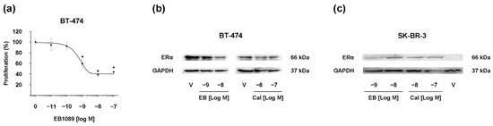EB1089 modulates cell proliferation and ERα protein expression in HER2-positive breast cancer cells. (a) BT-474 cells were treated with either vehicle (ethanol, 0.01%) or increasing concentrations of EB1089 for three days. Subsequently, cell viability was assessed using the Sulforhodamine B assay. Results are expressed as mean ± S.D. of triplicate determinations and represent two experiments. Data from vehicle-treated cells were normalized to 100%. * p < 0.001 vs. vehicle. (b) BT-474 and (c) SK-BR-3 cells were treated with EB1089 (EB) at 1 × 10−9 M and 1 × 10−8 M, calcitriol (Cal) at 1 × 10−8 M and 1 × 10−7 M, or their vehicle ethanol (V). After 48 h, the media were replaced with fresh media containing the same compounds, and the cells were further incubated for 48 additional hours. A representative image from two independent experiments is shown.