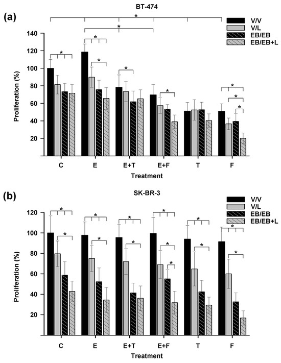 Figure 2b shows that treatments with estradiol, tamoxifen, and fulvestrant (E, T, and F, black bars), as well as the combination of the antiestrogens with estradiol (E + T, E + F, black bars), did not have any effect on the proliferation of SK-BR-3 cells compared to the vehicle-treated cells (C, black bar). These results were expected because SK-BR-3 cells lack a therapeutic target for antiestrogens.