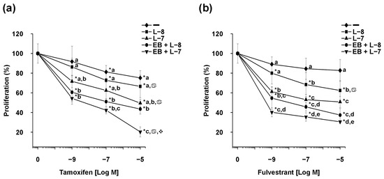 In addition, we conducted experiments involving dose–response curves for tamoxifen and fulvestrant in the presence of a constant concentration of EB1089 (EB, 1 × 10−9 M) and two concentrations of lapatinib (L-8, 1 × 10−8 M, and L-7, 1 × 10−7 M). For this, we selected BT-474 cells due to their expression of ERα. The results indicated that the addition of EB1089 and lapatinib at 1 × 10−8 M significantly reduced cell proliferation across all tamoxifen concentrations tested, compared to treatments without or with lapatinib at 1 × 10−8 M (Figure 3a).