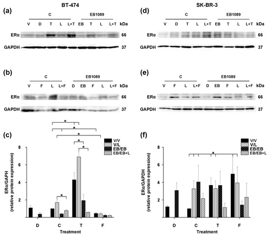 Modulation of ERα protein expression by the combination treatment of EB1089, lapatinib, and antiestrogens in HER2-positive breast cancer cells. (a–c) BT-474 and (d–f) SK-BR-3 cells were pretreated for 48 h in the presence of EB1089 (1 × 10−9 M) or its vehicle (V). Subsequently, the cells were treated for 48 h with tamoxifen (T, 1 × 10−7 M), fulvestrant (F, 1 × 10−7 M), lapatinib (L, 1 × 10−8 M) lapatinib vehicle DMSO (D), or the combinations of antiestrogens with the tyrosine kinase inhibitor. These treatments were performed in the absence or presence of EB1089. Western blot analysis detected ERα protein, and GAPDH was utilized as the loading control. (a,d) Representative blots of treatments involving tamoxifen or (b,e) fulvestrant from three independent experiments are shown. * p, one-way ANOVA. ▲ p, t-test.