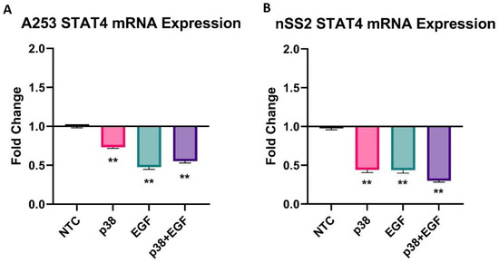 The mRNA expression of STAT4 was initially determined in A253 and nSS2 cells (Figure 2). The cells were cultured and treated with p38 inhibitor (20 µM) and EGF (10 ng/mL), and a combination of both. STAT4 expression was reduced in both cell lines in response to all three treatments of p38 inhibitor or EGF alone and the combination of both. In A253 cells the largest reduction resulted from EGF supplementation with an approximately two-fold reduction (Figure 2A). STAT4 expression in nSS2 ISGECs was similarly downregulated by EGF supplementation, but the combination of EGF and p38 inhibitor yielded an enhanced effect resulting in an approximately three-fold reduction (Figure 2B). The overall results indicate p38 inhibitor effects might be more pronounced on nSS2 cells.