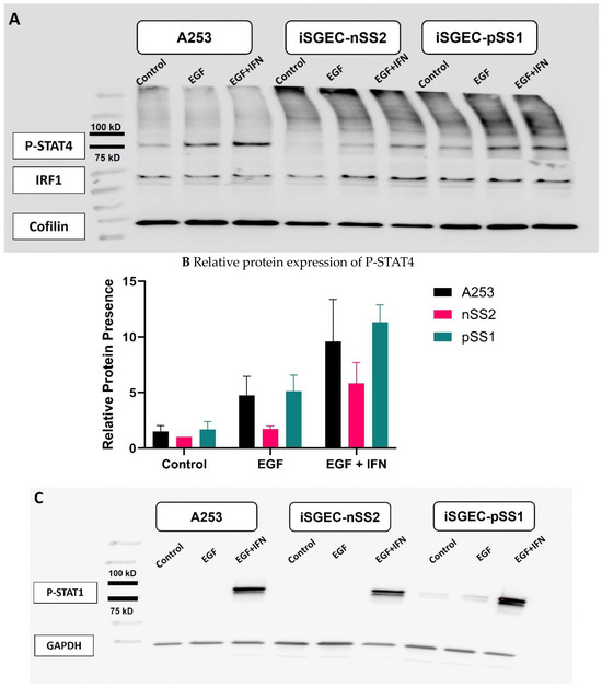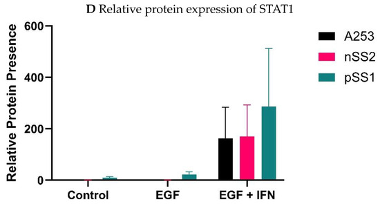 To better understand the effects of EGF and IFN-γ supplementations in A253 and iSGECs on phospho-STAT4 and phospho-STAT1 protein production, the presence of both proteins was determined by Western blot. In all three cell lines, phospho-STAT4 presence was slightly increased by EGF (p = 0.11262)) and further increased by the combination of EGF and IFN-γ (p = 0.003906) (Figure 3A). Notably, A253 and pSS1 cells demonstrated an approximate average of 8- and 4-fold increase in phospho-STAT4 levels, respectively, after supplementation with both EGF and IFN-γ (Figure 3B). These effects are in the opposite direction compared to our described mRNA expression results for A253 and nSS2 cells in which STAT4 mRNA was downregulated in response to the addition of EGF (Figure 2). Phospho-STAT1 was expressed at lower levels in both A253 and nSS2 cells compared to pSS iSGECs (p < 0.05, paired t-test) (Figure 3C). All three cell lines displayed a large increase in phospho-STAT1 relative expression with supplementation of both EGF and IFN-γ combined, this effect being solely attributed to IFN-γ (Figure 3D). Of these, pSS1 iSGECs showed the largest presence of phospho-STAT1 compared to A253 cells and nSS2 iSGECs (Figure 3D).