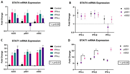 mRNA expression analysis of salivary gland cell lines A253, nSS2, and pSS1 treated with interferons α, β and γ. Legend. mRNA expression of STAT4 and STAT1 determined by RT-PCR was normalized to GAPDH. (A) Bar graph representing STAT4 mRNA relative expression in all cell lines treated with type I (IFN-alpha and -beta) and type II (IFN-gamma) interferons. (B) Plot showing differences in effects from type I and type II IFNs. (C,D) Bar graph representing STAT4 and STAT1 mRNA relative expression in all cell lines treated with type I (IFN-alpha and -beta) and type II (IFN-gamma) interferons and plot showing differences in effects of type I and type II IFNs. Error bars represent mean (+/−) standard error (SE) based on 9 independent experimental replicates. Mann–Whitney U-test was used to determine significance (** p < 0.01; * p < 0.05).