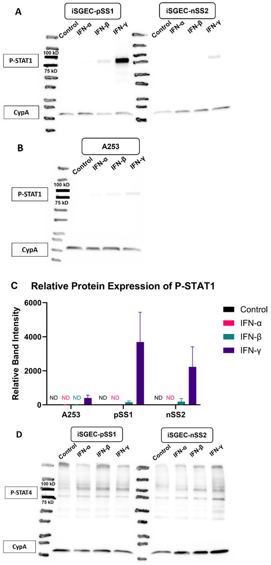 To further investigate the large effect of IFN-γ on STAT1 and STAT4 mRNA and protein expression, the effects of IFN-α and IFN-β protein supplementation were also assessed. The effects of IFN-α, IFN-β and IFN-γ on STAT4 and STAT1 mRNA expression in A253 cells, pSS1 and nSS2 ISGECs were determined. STAT4 expression was upregulated in all cell lines by IFN-α and IFN-β but was not changed by IFN-γ in pSS1 iSGECs (Figure 4A).