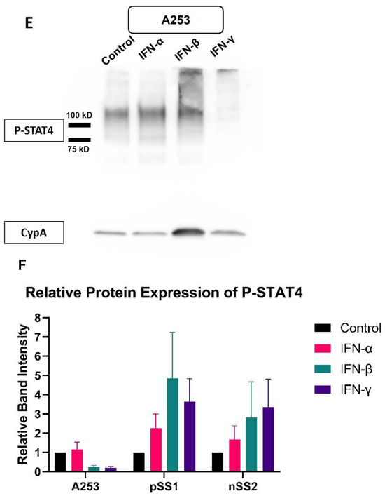 Following observation of an increase in STAT1 mRNA expression with type I and type II IFNs, expression changes of phospho-STAT1 and phospho-STAT4 were determined by Western blot analysis. Each cell line was grown with supplementation of IFN-α, IFN-β and IFN-γ and was harvested for protein after 72 h. Type I interferon IFN-β supplementation showed low relative expression in nSS2 cells and pSS1 cells for phospho-STAT1, whereas IFN-γ supplementation yielded a statistically significant increase in phospho-STAT1 in both pSS1 and nSS2 cells (Figure 5A). A253 cells were not significantly responsive to both type I and type II IFNs (p < 0.05). The relative expression of phospho-STAT1 based on the normalized control Cyclophilin A, is shown is Figure 5C. Western blots of phospho-STAT4 protein expression for the three cell lines are shown in Figure 5D,E. The relative protein expression for phospho-STAT4 is shown in Figure 5F. The data show a slight marginal effect of IFN-γ on pSS1 cells.