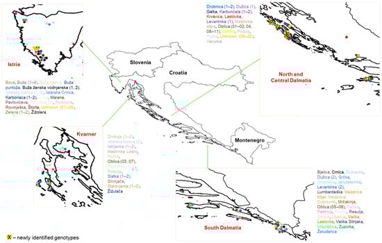 A number of putative cases of synonymy previously reported on the basis of morphological similarity were confirmed here, such as the group ‘Rošinjola’ (‘Rovinješka’ (Croat. ‘Rovinješka’ = female from Rovinj) and ‘Rošinjola’) [28] and ‘Uljarica’ (‘Zuzorka’ and ‘Uljarica’ (Croat. ulje = oil)) [26,60].