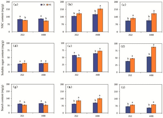 2.3. Content of NSC, Soluble Sugar, and Starch in Grains, Leaves, and Sheath Stems under Heat Stress