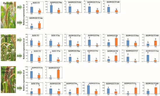 2.6. Expression Pattern of SUTs and SWEETs under Heat Stress