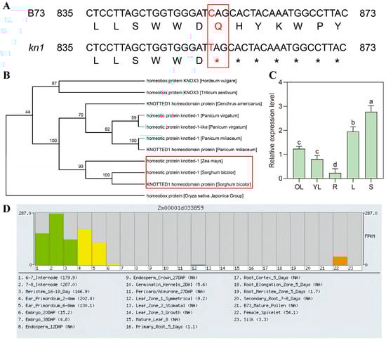 Basic bioinformatics analysis of KN1 gene in maize. (A) Partial sequence alignment analysis of coding sequence of the KN1 gene in wild-type B73 and mutant kn1. * indicates sites where the corresponding amino acid does not exist. The red letters in the DNA sequence indicate the site of the mutation induced by EMS. The red letters in the amino acid sequence indicate amino acid residues that have changed as a result of mutations. The range marked in the red box indicates the locations in the DNA sequence where mutation occurs and the location in the amino acid sequence where mutations affect amino acid type changes. (B) Phylogenetic tree constructed based on the KN1 gene in maize. The red box indicates the position of KN1 in maize and the KN1 protein with the highest similarity to it in the phylogenetic tree. (C) Relative expression levels of KN1 gene in various tissues. Different lowercase letters represent a statistically significant difference with a confidence level of “p < 0.05” (one-way analysis of variance, Tukey’s method). (D) KN1 gene relative expression dataset retrieved from MaizeGDB website. Note: OL–old leaves; YL–young leaves; R–roots; L–the pulvinus of the second leaf at the V3 growth stage; S–stems.