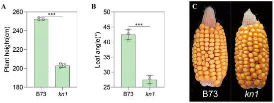 Analysis of major phenotypic traits in B73 and kn1. (A) Results of plant height measurements for B73 and kn1 (n = 3 biological replicates). (B) Results of LA measurements for B73 and kn1 (n = 3 biological replicates). (C) Mature ear phenotypes of B73 and kn1. Note: Unpaired two-tailed Student’s t-tests was used to detect the significance of differences between the two groups. *** indicates p < 0.001. LA–leaf angle. Data are expressed as mean ± SD.