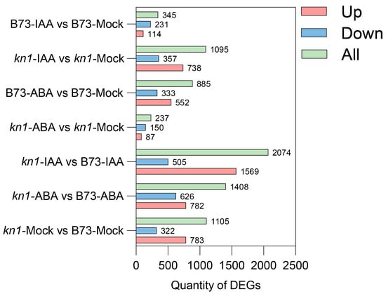 Differentially expressed genes (DEGs) in all samples were screened according to thresholds set in the DESeq R package (v1.18.0) (|log2Foldchange| > 1, q < 0.05) (Figure 4 and Figure S1). A total of 1105 DEGs were obtained in the Mock group without phytohormone treatment, with 783 upregulated and 322 downregulated DEGs (Figure S1A). A total of 1408 DEGs were obtained in the group of B73 and kn1 treated with 10 μM exogenous ABA, among which 782 upregulated and 626 downregulated DEGs were obtained, respectively (Figure S1B). A total of 2074 DEGs were obtained in the group of B73 and kn1 treated with 100 μM exogenous IAA, among which 1569 upregulated and 505 downregulated DEGs were obtained, respectively (Figure S1C). There were 885 (552 upregulated and 333 downregulated) and 237 (87 upregulated and 150 downregulated) DEGs of B73 (Figure S1E) and kn1 (Figure S1D) before and after 10 μM exogenous ABA treatment, respectively. There were 345 (114 upregulated and 231 downregulated) and 1095 (738 upregulated and 357 downregulated) DEGs of B73 (Figure S1G) and kn1 (Figure S1F) before and after 100 μM exogenous IAA treatment, respectively.