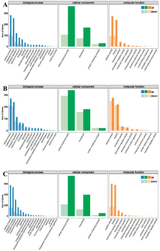 GO enrichment analysis of DEGs produced by B73 and kn1 under different treatment conditions. (A) GO enrichment analysis of B73-Mock vs. kn1-Mock; (B) GO enrichment analysis of B73-ABA vs. kn1-ABA; (C) GO enrichment analysis of B73-IAA vs. kn1-IAA.