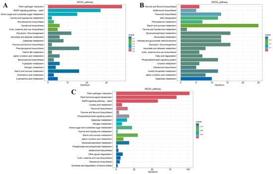 KEGG pathway enrichment analysis of DEGs produced by B73 and kn1 under different treatment conditions. (A) KEGG pathway enrichment analysis of B73-Mock vs. kn1-Mock; (B) KEGG pathway enrichment analysis of B73-ABA vs. kn1-ABA; (C) KEGG pathway enrichment analysis of B73-IAA vs. kn1-IAA.