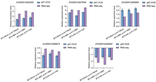 Five common DEGs were randomly selected from the RNA-seq data of the three comparison groups of B73-Mock vs. kn1-Mock, B73-ABA vs. kn1-ABA and B73-IAA vs. kn1-IAA, and their expression patterns were verified by qRT-PCR. The verification results showed that the expression patterns and trends of the five selected DEGs in all comparison groups were the same as those in the RNA-seq data (Figure 7), which proved the reliability of the RNA-seq data in this study.
