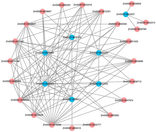 To explore the correlation between DEGs obtained from RNA-seq data and LA phenotypic data, DEGs meeting the criteria of “FPKM ≥ 10” were screened from the RNA-seq data for WGCNA analysis to mine hub genes. The analysis results showed that all the DEGs were clustered into four different modules (Figure 8A,B), among which the genes in the gray module did not have any characteristic expression patterns, so they were not clustered into the other three characteristic expression modules. The relationship between each co-expression module and LA was analyzed, and the results showed that among the three co-expression modules, the blue module showed the highest correlation with the LA of maize (Figure 8C). The expression profile of genes in the blue co-expression module is shown in the heatmap (Figure 8D). In order to further explore the relationship between the genes in the blue module and LA in maize and to mine the genes related to the regulation of LA, the STRING database was used to construct the protein–protein interaction (PPI) network for the genes in the blue module, and the confidence parameter was set as “comprehensive score > 0.4”. Co-expression network analysis showed that seven genes located in the center of the network were identified in the blue module, which were called hub genes (Figure 9). In order to further explore the biological functions of hub genes related to LA in maize, GO enrichment and KEGG pathway enrichment analysis were performed. GO enrichment analysis showed that the seven hub genes in the blue module were mainly involved in the plasma membrane, nucleus, cellular membrane components, cell wall biogenesis and cellulose biosynthesis. KEGG pathway enrichment analysis showed that the key genes in the blue module were mainly involved in plant–pathogen interaction (Table S3).