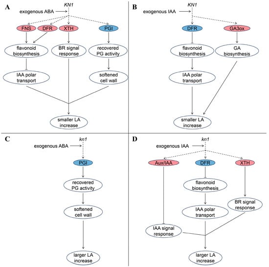 A possible molecular model of KN1 regulating LA with exogenous phytohormones. (A) Molecular model of WT KN1 regulating LA under exogenous ABA treatment. (B) Molecular model of WT KN1 regulating LA under exogenous IAA treatment. (C) Molecular model of mutant kn1 regulating LA under exogenous ABA treatment. (D) Molecular model of mutant kn1 regulating LA under exogenous IAA treatment. Note: Black lines ending with arrows and vertical lines represent promoting and inhibiting regulation, respectively. Solid and dashed lines represent the determined and undetermined interactions in the signaling pathway, respectively. Red and blue indicate differentially expressed genes that are upregulated and downregulated, respectively.