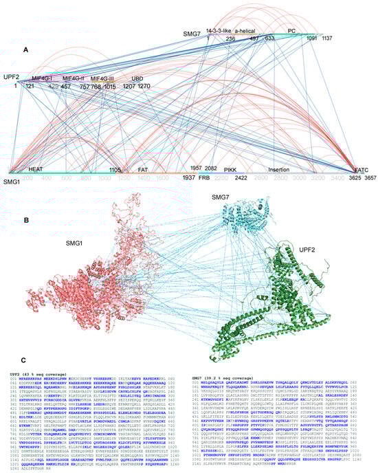 The domain-wise distribution of protein–protein interactions (PPIs) between the SMG1–UPF2–SMG7 complex within the NMD machinery. (A) Interactions plot of SMG1, UPF2, and SMG7 from the NMD pathway. Inter- and intramolecular interactions are presented in blue and red, respectively. (B) Full-length structures of SMG1, UPF2, and SMG7 genes and their intermolecular interactions identified in cross-linking MS experiments are shown as blue lines. (C) Sequence coverage of UPF2 and SMG7 genes based on the cross-linked peptides identified that are involved in the PPIs. Blue sequences are highlighted showing intermolecular interactions. The SMG1 domains, HEAT (Huntingtin), FAT (focal adhesion kinase domain), PIKK (phosphatidylinositol 3-kinase-related protein kinase domain), FATC (C-terminal FAT domain), SMG7 domains, and PC (C-terminal proline-rich region) are highlighted by different colours.