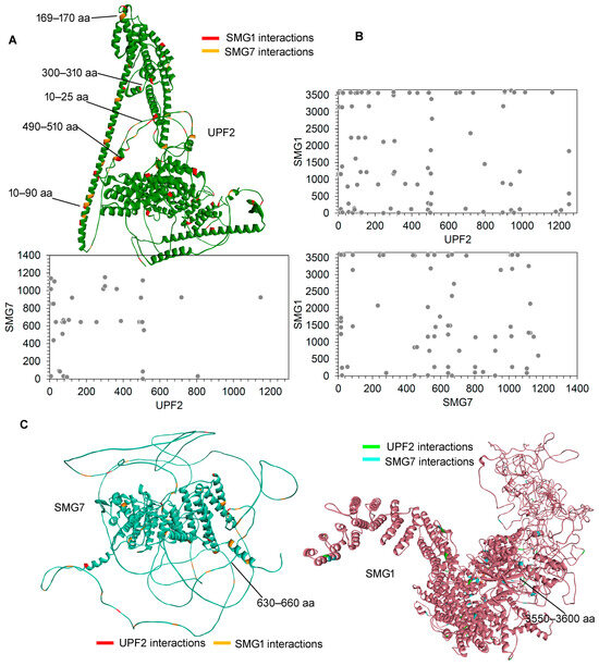 Comparing the SMG1–UPF2–SMG7 network identified in our cross-linking MS experiments with the existing structures of the SMG1, UPF2, or SMG7 genes highlighted that this network has a crucial role in the degradation of mRNA with PTCs. The following known structures in the rcsb pdb database with different partners [32] are available: SMG1-SMG8-SMG9-UPF1 (pdb id.: 6z3r [33]); SMG5-SMG7 (pdb id.: 3zhe [34]); UPF1-UPF2 (pdb id.: 2wjv [35]); and UPF2-UPF3 (pdb id.: 1uw4 [36]; Figure 4A). Many of the interaction residues from our cross-linking MS have different sites compared to known interactions (Figure 4A), in particular, the UPF1 and UPF3 docks [35,36] with UPF2 where a deficit in cross-linked peptides was traced. The SMG1 binds with SMG8 and SMG9 [23] on the flip side of the conformation when compared to its interactions with UPF2 or SMG7 (Figure 4A). In addition, a similar difference is observed in the interaction pattern of SMG7 with SMG5 [34] and our cross-linked identified partners of the SMG1–UPF2–SMG7 complex (Figure 4A).