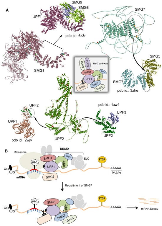 The inter-relational functionality of NMD components gives directions about the conserved protein–protein interfaces or interactions. Upon activation of the NMD process, it initiates the formation of the SURF surveillance network consisting of UPF1, SMG1, eRF1, and eRF3 genes. This SURF complex interacts with the UPF2, UPF3b, and an EJC downstream of the PTC, forming the decay-inducing complex (DECID) [10]. In particular, the UPF3b docks with the EJC along with anchoring with the UPF2 protein. The phosphorylation of UPF1 by SMG1 is promoted by UPFs and the SURF complex, whereas the dephosphorylation is a multiprotein process (SMG5, SMG6, SMG7, and PP2A; protein phosphatase 2A) [11]. Recruitment of SMG7 to UPF1 targets the mRNA containing PTCs for degradation and interactions of PP2A with SMG7 dephosphorylate UPF1 and prepares a second NMD round. Allowing for the fine-tuning of the NMD activity, the UPF3a protein inhibits NMD, and this activity is regulated by the UPF3b protein [12]. It has been reported that RNA binding and ATPase/unwinding activity of the UPF1 gene is regulated by UPF2. The UPF1 RNA-unwinding activity is increased upon interacting with UPF2, the UPF1 CH-domain is displaced, and domain 1B changes to a conformation where it does not clamp on the mRNA 3′ end [13,14].