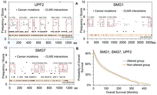 Influence of cancer mutations on the SMG1–UPF2–SMG7 network. (A) Cancer-derived mutational landscape compared with the cross-linked MS-identified PPIs between the SMG1, UPF2, and SMG7 genes. Individual variants were derived from different cancer types from the cBioPortal [38] and COSMIC [39] databases. Specific sites of interactions and mutations in different cancer types are marked with a red box. In addition, the mutations emerging specifically from cBioPortal are highlighted in orange box. (B) Probability of overall survival of patients compared with their survival in months of the altered and unaltered groups. Data retrieved from the cBioPortal [38] database.